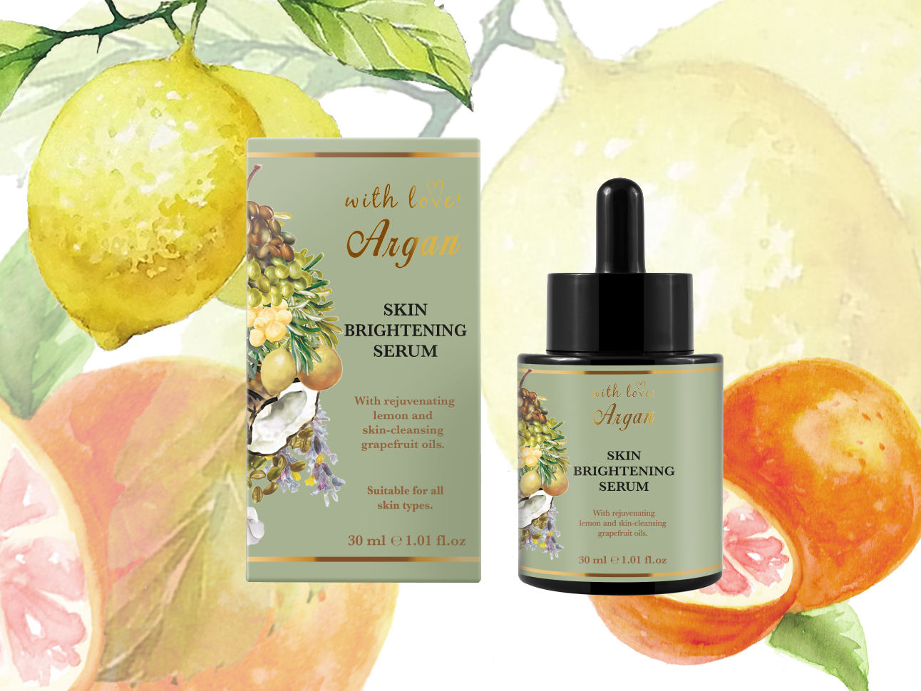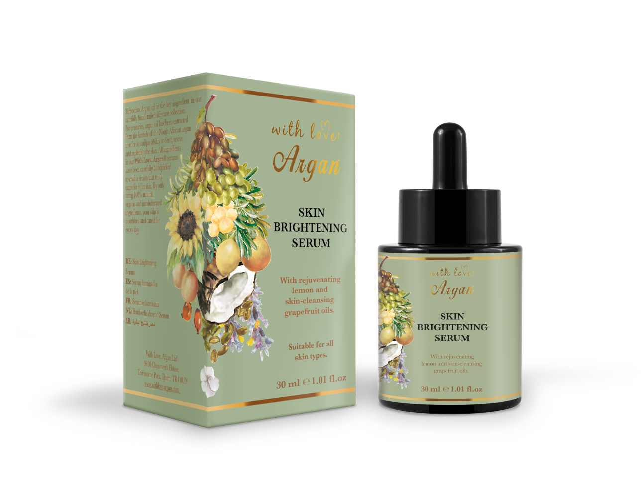 Skin Brightening Serum With rejuvenating lemon and skin-cleansing grapefruit oils. 100% natural and cruelty-free Made in England Suitable for all skin types 30 ml e 1.01 fl.oz —— - - With Love!, Argan® Moroccan Argan oil is the key ingredient in our carefully handcrafted skincare collection. For centuries, argan oil has been extracted from the kernels of the North African argan tree for its unique ability to feed, revive and replenish the skin. All ingredients in our With Love!, Argan® serums have been carefully handpicked to craft a serum that truly cares for your skin. By only using 100% natural, organic and unadulterated ingredients, your skin is nourished and cared for every day. ———— Skin Brightening Serum: Helps reduce discolouration, blemishes and spots, working to prevent the appearance of premature ageing. Directions for use: After cleansing your skin, apply a small amount to your fingertips and press evenly into your skin. Allow to absorb before applying your make-up. With Love!, Argan® freshly made serums are effective at keeping the skin protected and moisturised so no additional creams are needed. Use AM and PM to help condition and care for your skin. Precautions: Discontinue use if irritation occurs. Avoid contact with eyes. Do not ingest. Keep in a cool, dry place away from direct sunlight. Argan oil is a nut derived natural ingredient. Not suitable for those with a nut allergy or sensitivities to natural ingredients. Recommendations: Double cleanse your skin with our organic and natural With Love!, Argan® soap before applying the serum, helping you to nourish your skin more deeply. Ingredients: Argania Spinosa (Argan) kernel oil, Rosa Canina (Rose hip) seed oil, Nigella Sativa Seed Oil, Tocopherol, Daucus Carota Sativa (Carrot) Seed Oil, Citrus Medica Limonum (Lemon) Peel Oil, Citrus Grandis (Grapefruit) Peel Oil, Boswellia Carterii Oil, Benzyl Benzoate, Citral, Limonene, Linalool. Skin Brightening Serum * Cleansing * Rejuvenating * Illuminating * Purifying * Antioxidant-rich * Non-comedogenic RRP: £80.00